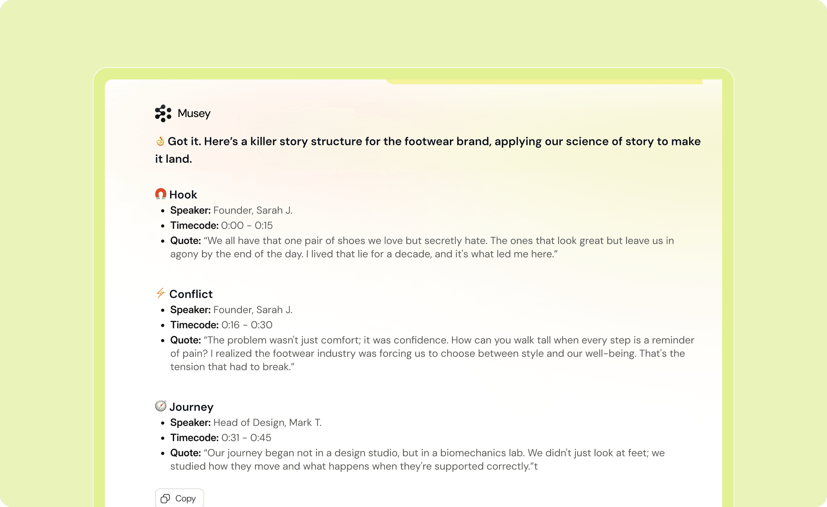 Command Musey to rearrange the best quotes into a seamless narrative arc that matches your vision.