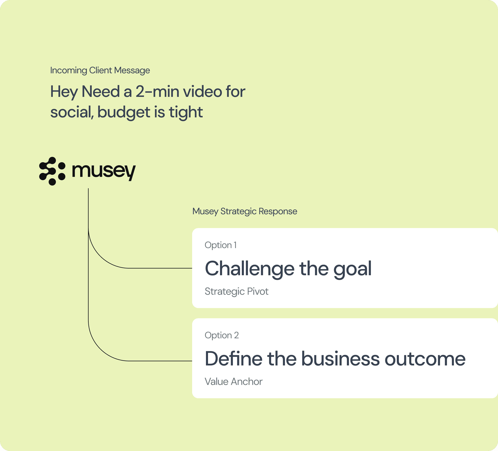 Clients treat you like a pair of hands because you talk about gear and days. Musey gives you the questions, frameworks, and language to talk about business outcomes, instantly positioning you as a Strategic Partner who commands premium fees.