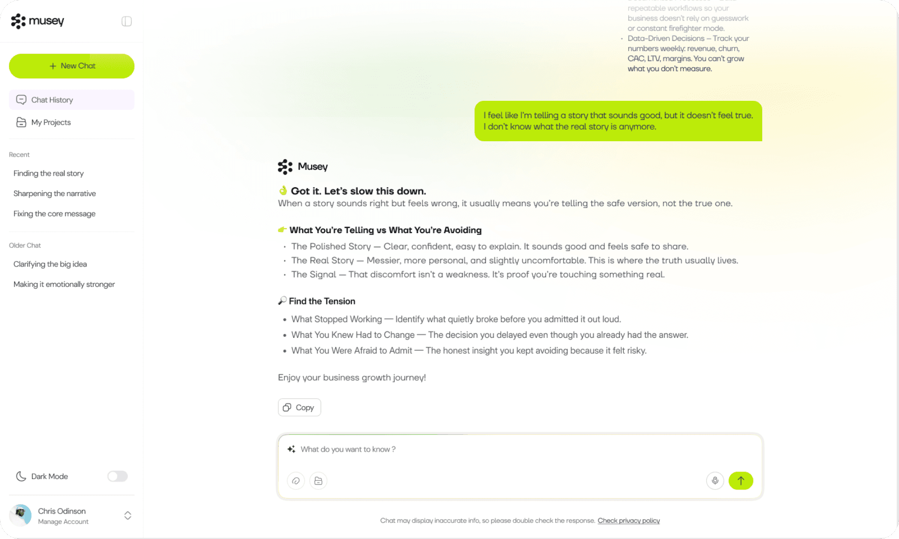While ChatGPT was reading Reddit, Musey was ingesting 100+ hours of high-stakes mentorship calls. It hasn't just read about filmmaking business problems; it has listened to us solve them in real-time. It gives you battle-tested advice that actually works in the field, not theory that sounds good on a blog.