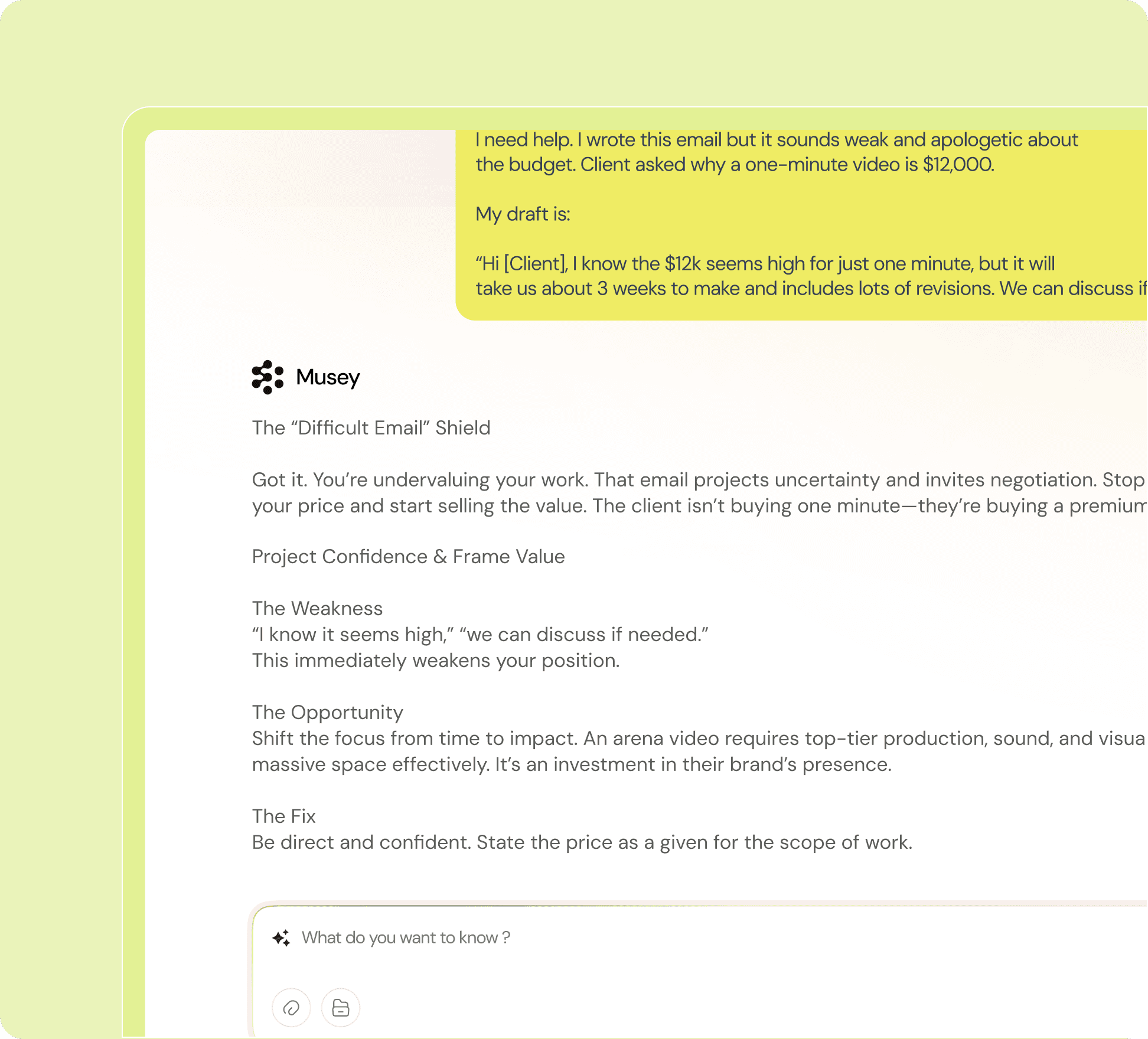 Imposter syndrome kills more careers than bad lighting. Before you hit send on that email or step into that pitch, run it through Musey. It validates your strategy and arms you with the logic to defend your creative choices and your budget.